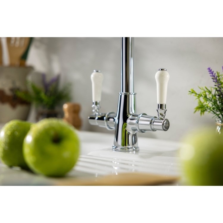 The Abode Keswick Dual Lever Mixer Tap in Chrome offers a timeless take on traditional kitchen design. With a sculpted body, swan neck spout and distinctive white lever handles, this deck-mounted tap strikes a refined balance between classic charm and modern functionality. The 1/4 turn ceramic disc valves deliver smooth control and long-lasting performance, while its chrome finish enhances the elegant design. Perfect for period-style or transitional kitchens, the Keswick tap also features a replaceable aerator for easy maintenance.