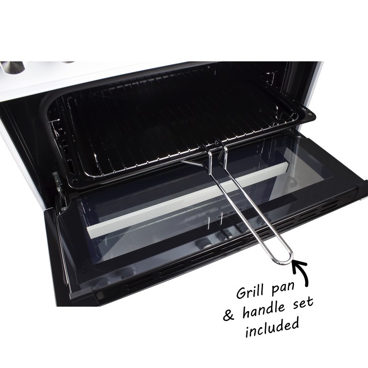 You’re guaranteed a quality cooking experience with this cooker. The oven has an integrated thermostat, ensuring temperatures are controlled and maintained for even cooking results every time. With double glazed doors heat is locked in and with an interior oven light you can quickly check up on a dish without opening the oven and letting any heat escape. The inside of the oven and grill feature embossed shelving spaces, which means the included shelves are easier to slide in and out and both cavities are much easier to clean.