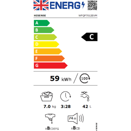 The Hisense 1 Series WFQP9014EVM Washing Machine offers high-performance laundry care, featuring a 7kg capacity, 1400 spin speed and 15 wash programs, including steam technology for a fresh, crease-free finish. The Quick Wash program handles small loads in just 15 minutes. The self-diagnostic function helps ensure the appliance is well maintained and last longer. And Inverter Technology allows your washing machine’s motor to rotate at the optimum speed for the load. This results in lower levels of vibration meaning a quieter, longer lasting, and more reliable washing machine that uses less energy than conventional washers.