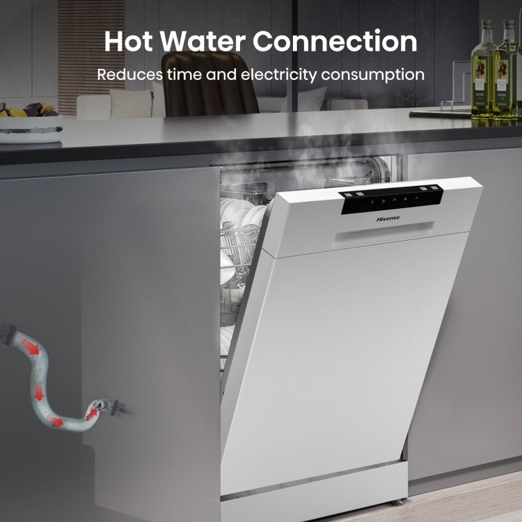The Hisense HS523E15WUK Slimline Dishwasher combines efficient performance with compact design, offering 10 place settings to tackle up to 110 items in one go, perfect for smaller kitchens or households. Its flexible, adjustable baskets and cutlery tray make loading a breeze, even for awkward items. With six wash programmes, including a 30-minute quick wash for lightly soiled dishes and an Eco mode to save energy and water, it fits seamlessly into busy lifestyles. The hot water connection reduces programme times and electricity consumption, adding even more efficiency to your kitchen. Plus, the Half Load feature delivers speedy cleaning without wasting resources, all while its whisper-quiet operation keeps your kitchen serene.