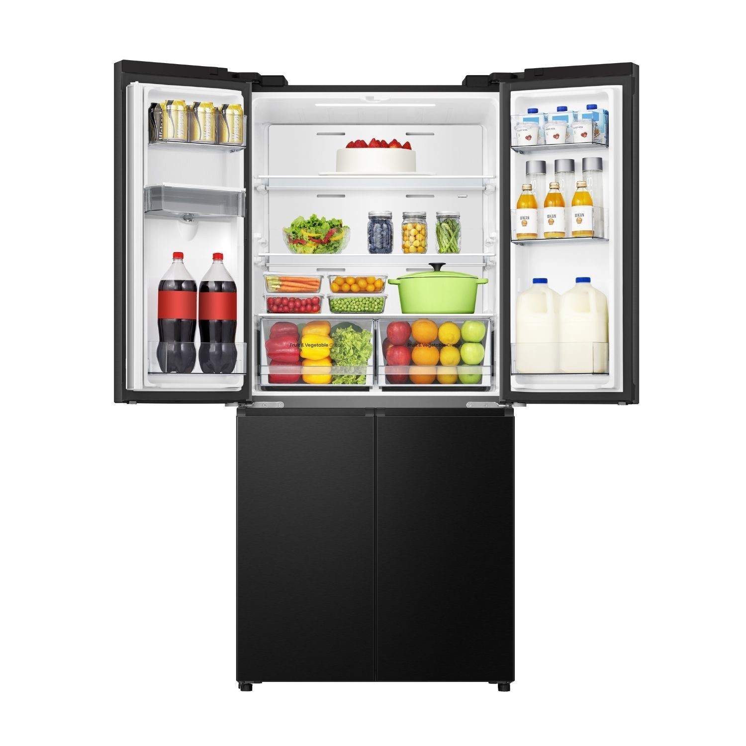 It has a big capacity, so there’s plenty of space in the fridge and freezer to store any shape or type of food. It also has four doors that open out wide, so you can see everything at a glance.