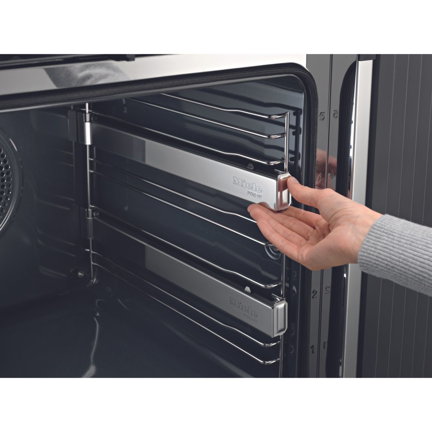 Miele ovens are cooled on all sides. This ensures that controls, handles and adjacent cabinets stay relatively cool to the touch. The multi-layer panels insulate the oven door effectively and ensure a low temperature on the outside of the door, providing safety and protection against burns.