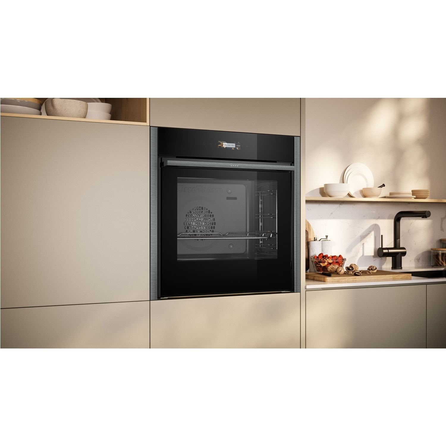 The Neff N70 B54CR31G0B Slide&Hide® single oven has a 71L capacity with 14 heating methods including fan, top/bottom heat, and grill settings. With specialist functions for dough proving and bread baking perfect for bakers and the automatic meal settings set the temperature, heating method, and cooking time for a range of recipes. The 3.7-inch Full Touch TFT Display high-resolution screen is easy to navigate and the oven can also be controlled with your voice through Amazon Alexa or through the Home Connect app where you can monitor the oven, save your favourite frequently used settings, and download automatic meal programmes. This oven also has a catalytic back panel that cleans while you cook and has a handy steam cleaning function to make oven cleaning easier.