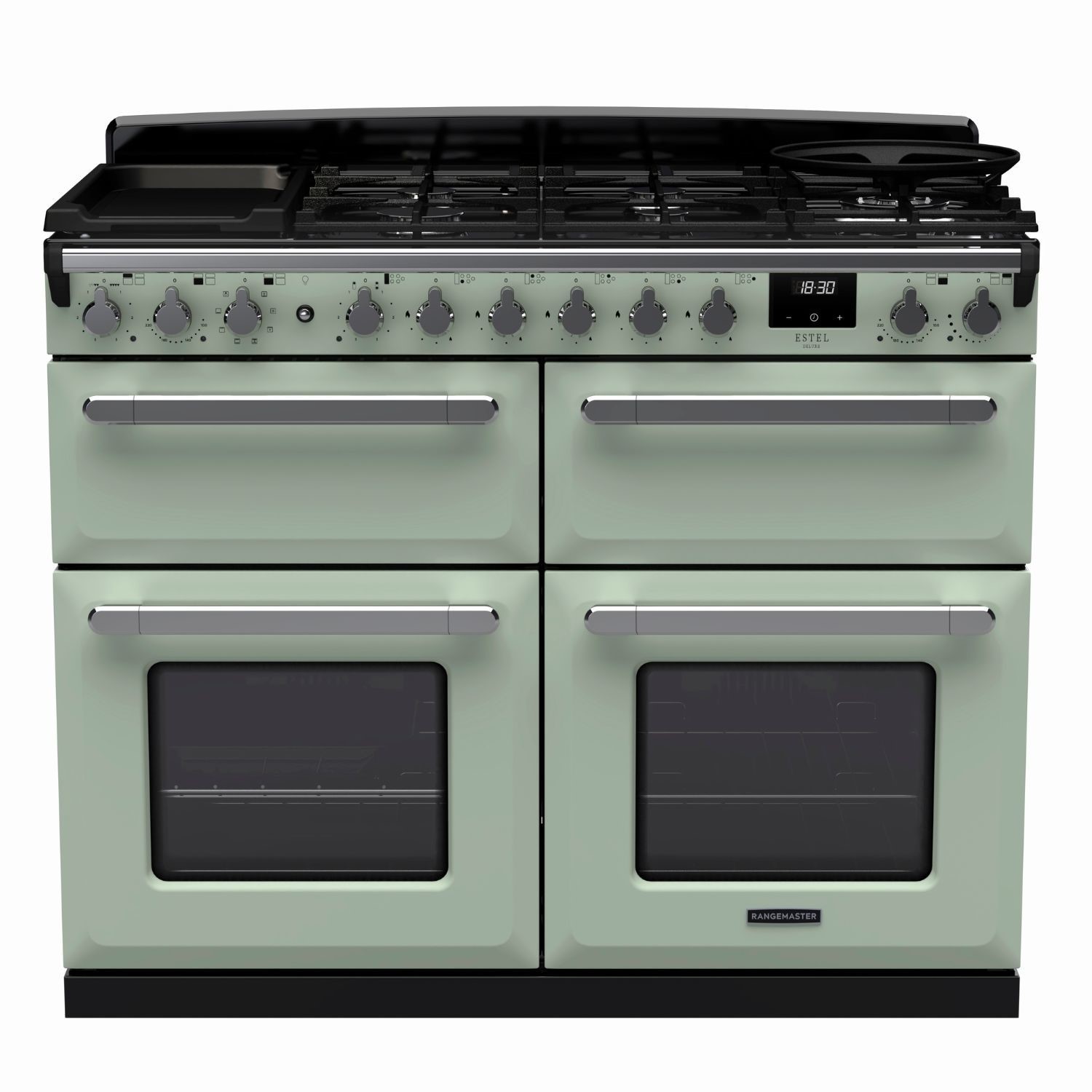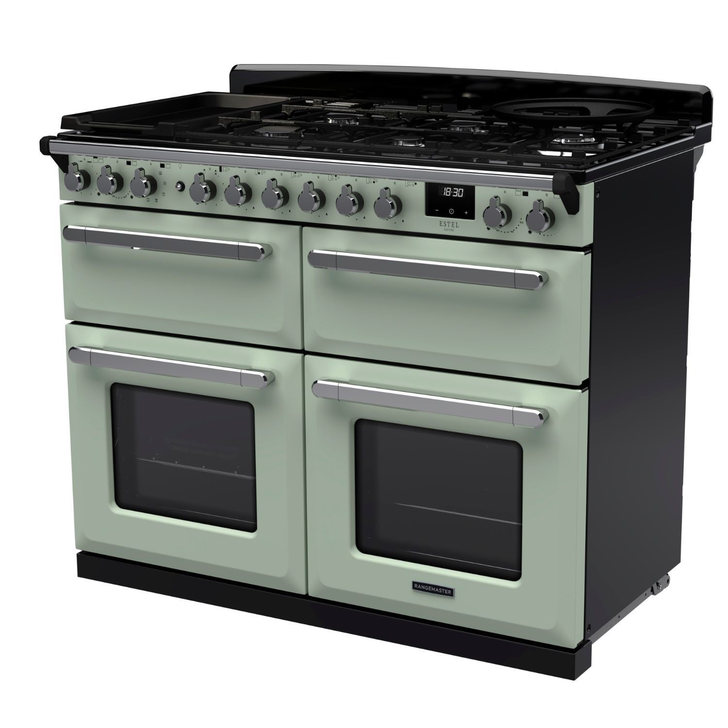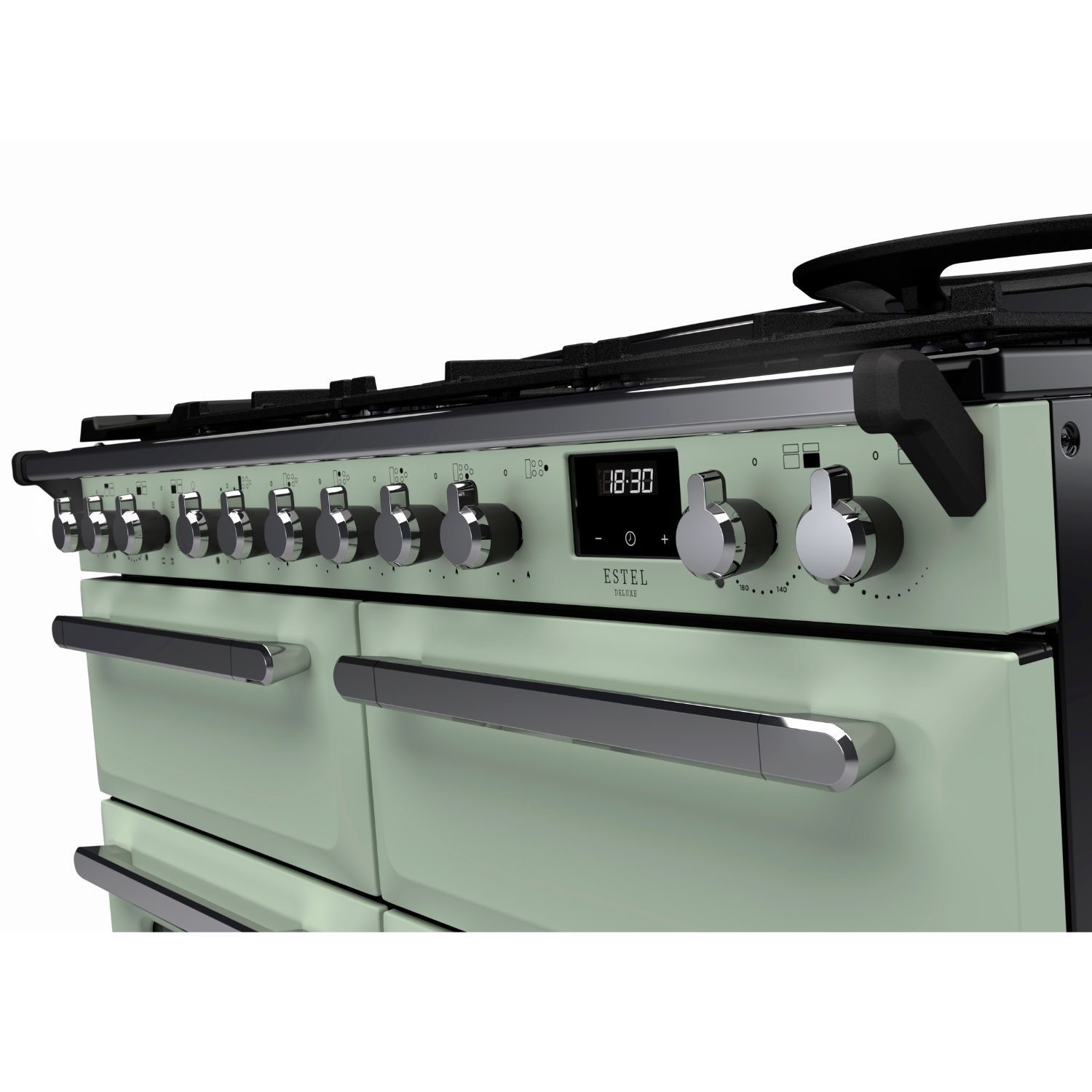 The Estel Deluxe 110cm range cooker embodies a classic and timeless aesthetic, blending retro and traditional elements with clean geometric lines and signature chamfered edges. Its design is inspired by utility and durability, offering a practical yet stylish option for those who value timeless functionality. The unique control dials and handles feature a chunky yet ergonomic design that enhances the nostalgic look, perfectly suited to traditional and modern kitchen design in a choice of eight colours, from pastel hues to classic neutral shades.