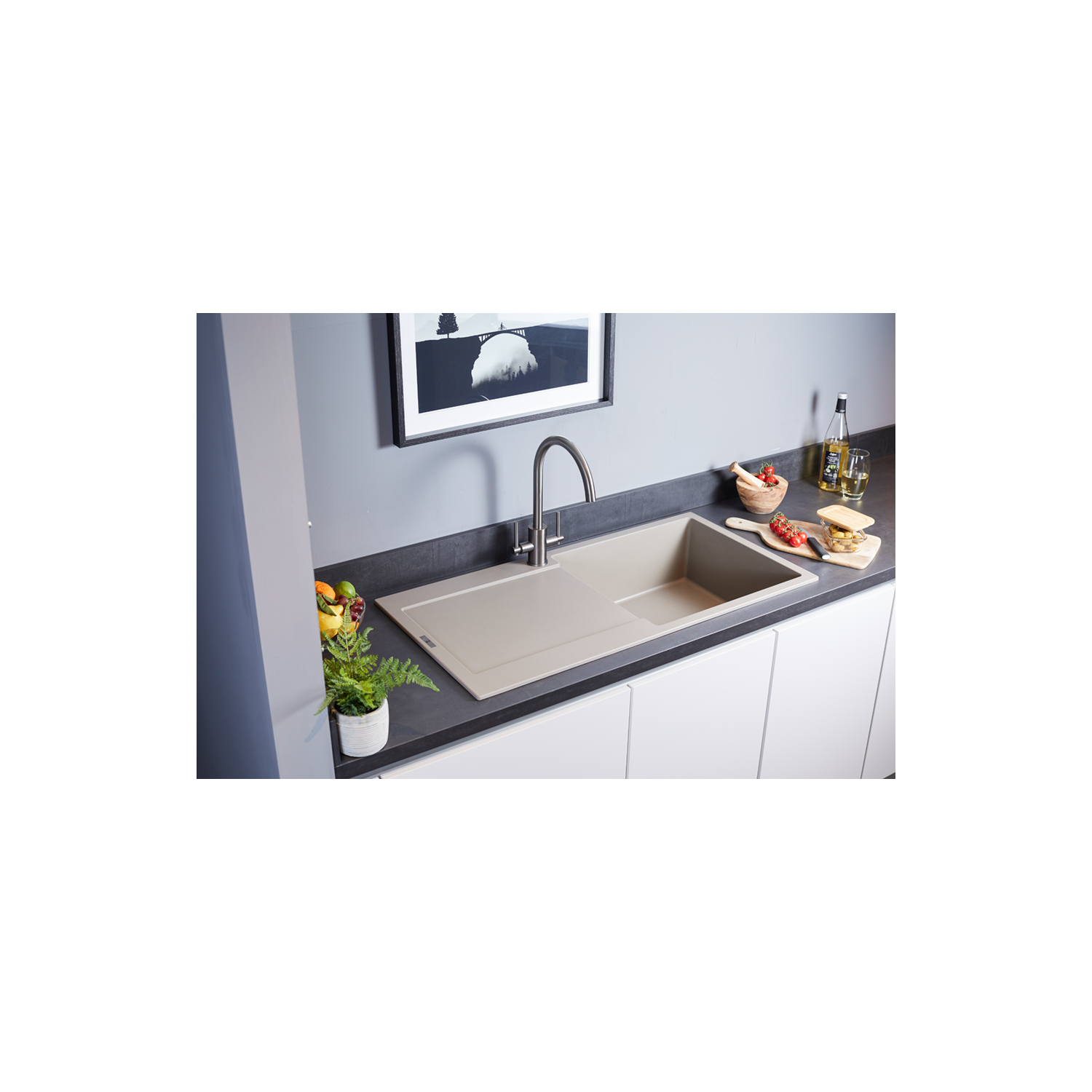 This sleek matt black composite kitchen sink is on-trend and guaranteed to create a focal point in any kitchen. Made from durable granite composite, it’s gentle on your dishware and hygienic, as there’re no nooks and crannies for germs to hide. The smooth finish means it’s low maintenance, ensuring longevity.