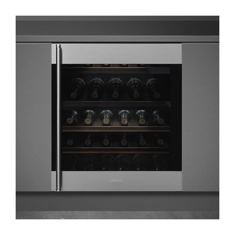 This built-in Smeg wine cooler has a maximum bottle capacity of 38 bottles. This stainless steel wine cooler has black glass and the fingerproof finishing keeps the stainless steel looking as good as new. The easy to use touch controls allow the appliance to be programmed at the touch a button. The automatic defrost feature works by automatically defrosting at regular intervals eliminating the need to defrost altogether. The two independent temperature zones on this CVI338RX3 make it possible to set the temperature necessary for red wines and white/sparkling wines.