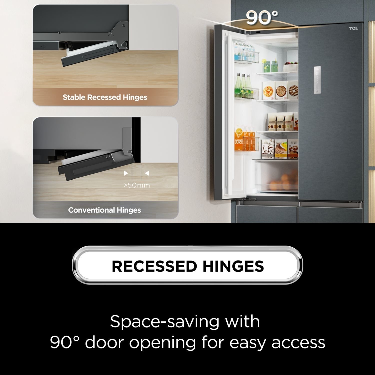 - Space-friendly with recessed hinges and a 90° door opening for easy access