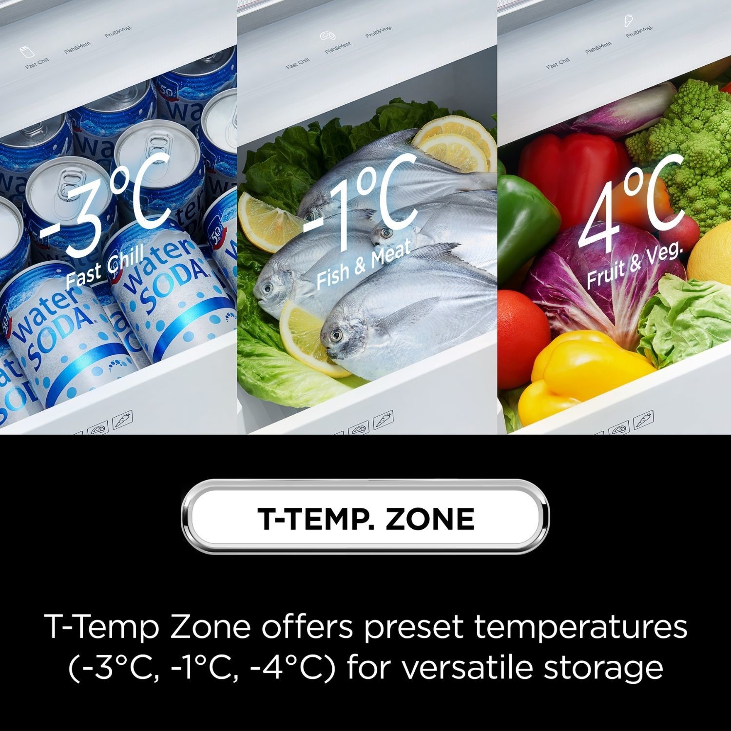 The zone provides three pre-set temperatures i.e. -3°C/-1°C/-4°C which are available at a touch of a button on the digital panel, providing flexibility for families with the need to store different types of food at large quantity.